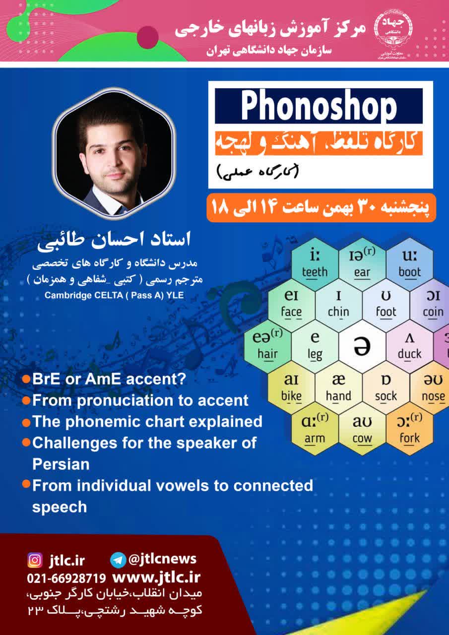 کارگاه تخصصی تلفظ زبان انگلیسی در روز پنجشنبه ۳۰ بهمن ۱۴۰۴ از ساعت ۱۴:۰۰ تا ۱۸:۰۰، با تدریس دکتر طائبی در مرکز آموزش زبان های خارجی سازمان جهاد دانشگاهی تهران برگزار می شود. مخاطبان آن همه زبانآموزان از سطح Elementary تا Advanced می باشند.